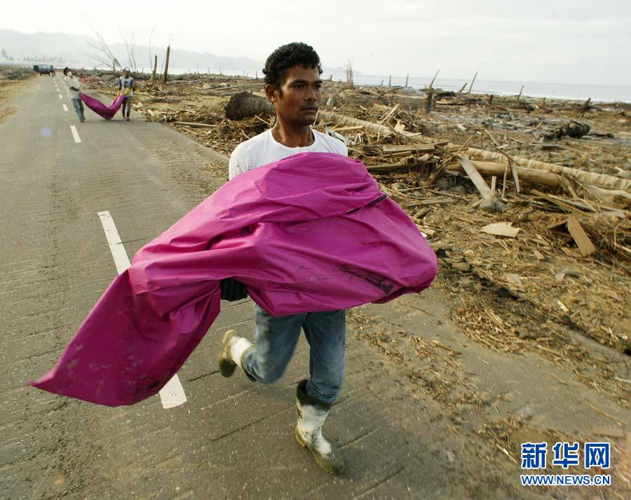 2005年1月27日,在印度尼西亞班達亞齊,一名男子將海嘯遇難者的遺體運往墓地。 新華社/路透(李木子編輯)