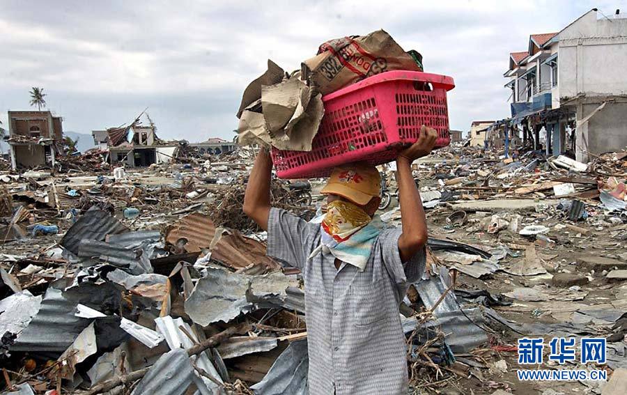 2004年12月31日,在印度尼西亞班達亞齊,一名男子從海嘯摧毀的家中搬出物品。 新華社/法新(李木子編輯)