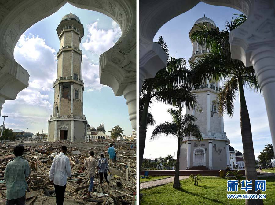 這張拼版照片顯示的是:2004年12月28日拍攝的海嘯襲擊後的印度尼西亞亞齊省首府班達亞齊的一座清真寺(左圖);2014年11月27日拍攝的印度尼西亞亞齊省首府班達亞齊的同一地點(右圖)。新華社/法新(李木子編輯)