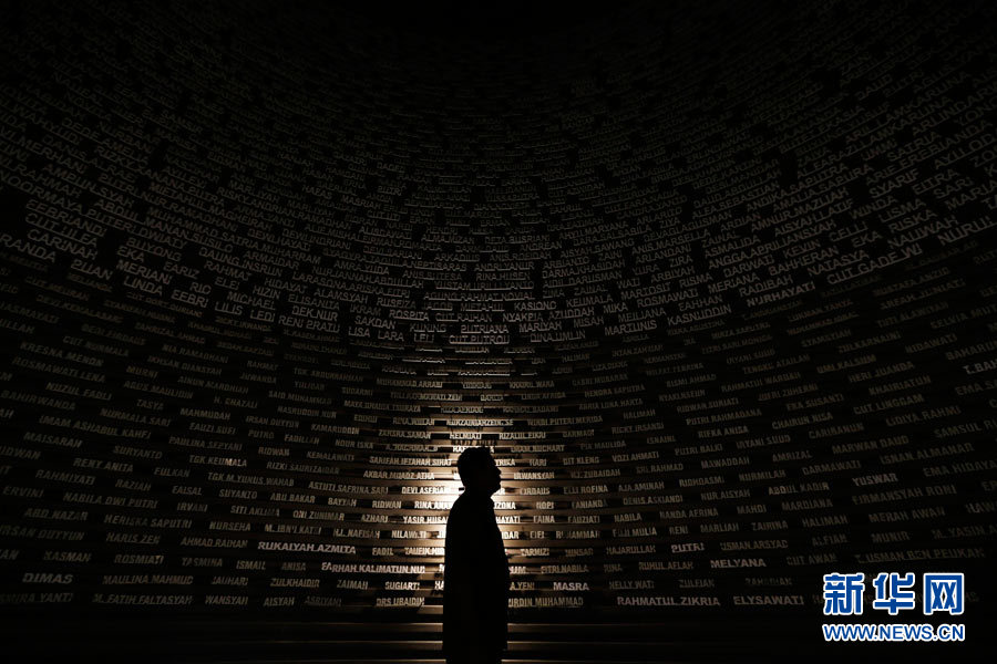 2014年12月25日,在印度尼西亞班達亞齊的海嘯博物館,一名男子注視着牆上印度洋海嘯遇難者的名字。 新華社/路透(李木子編輯)