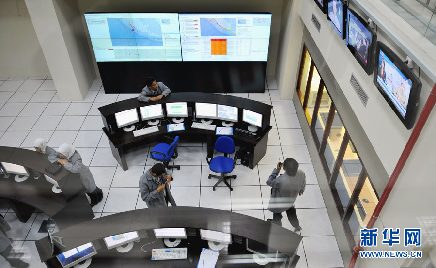 2008年11月11日,在印度尼西亞首都雅加達,技術人員在氣象和地球物理局內工作。自2005年開始動工興建、耗資1.33億美元的印度尼西亞海嘯預警系統當日正式啓用。新華社/法新(李木子編輯)