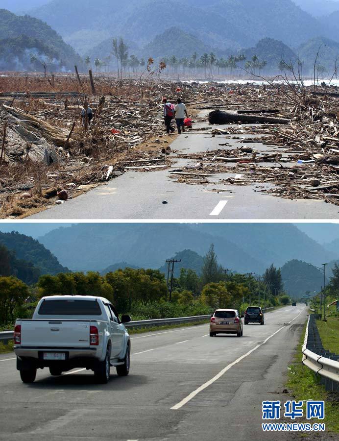 這張拼版照片顯示的是:2005年1月9日拍攝的海嘯襲擊後的印度尼西亞亞齊省首府班達亞齊的濱海公路(上圖);2014年11月29日拍攝的印度尼西亞亞齊省首府班達亞齊的同一地點(下圖)。新華社/法新(李木子編輯)