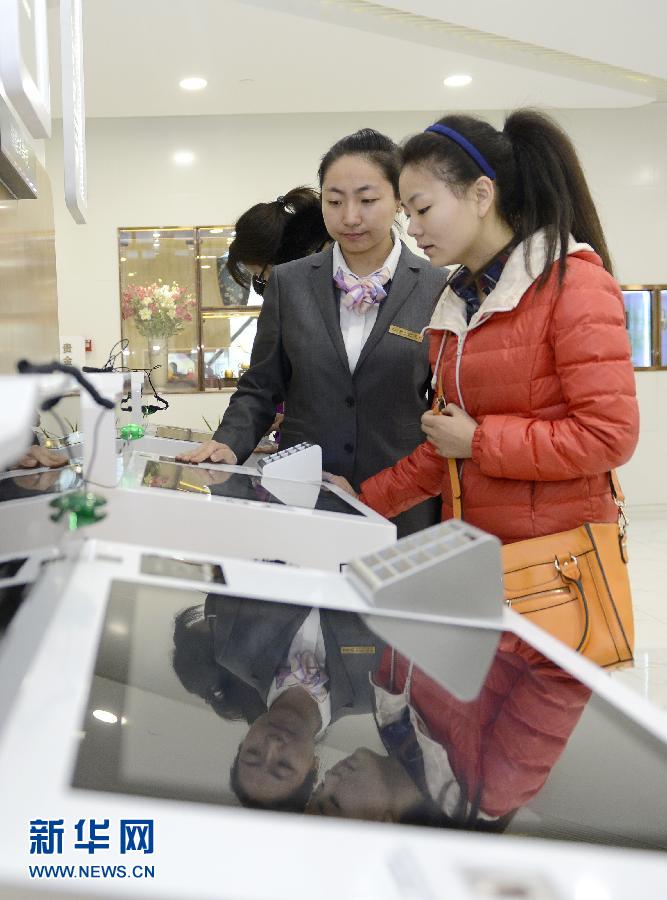 12月29日,一位客户在客户經理的指引下購買理財產品。當日,中國工商銀行西單智能銀行正式對外營業,西單智能銀行集中了當前銀行業最先進的智能設備,如智能終端、產品領取機、外幣兑換機、硬幣兑換機等,客户在這裏可以自助完成絕大部分的銀行業務。智能銀行的成立,是工商銀行打造e-ICBC,將“以客户為中心”“開放共享”等互聯網思維向線下網點深度移植,對傳統服務實行現代化改造的新嘗試。新華社發(戴旭明 攝)