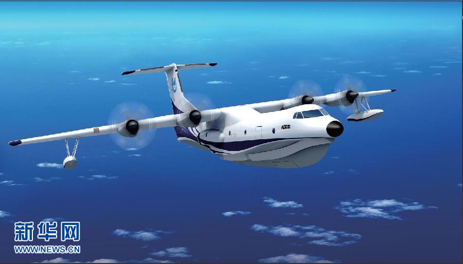大型滅火/水上救援水陸兩棲飛機AG600設計圖(資料照片)。當日,大型滅火/水上救援水陸兩棲飛機AG600首個大部件——中機身在中航飛機西安分公司順利下架,標誌着AG600飛機進入整體裝配階段,項目研製取得階段性成果。 AG600飛機是國務院立項批覆的三個大型民機飛機項目之一。主要用於森林滅火和水上救援。 新華社記者 李華 攝