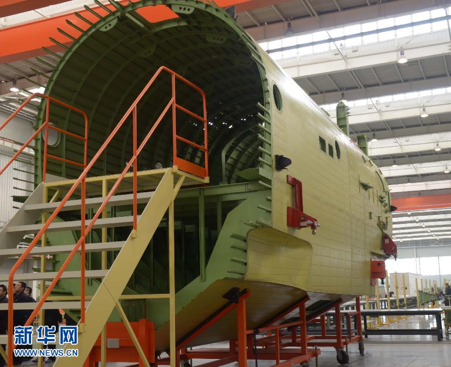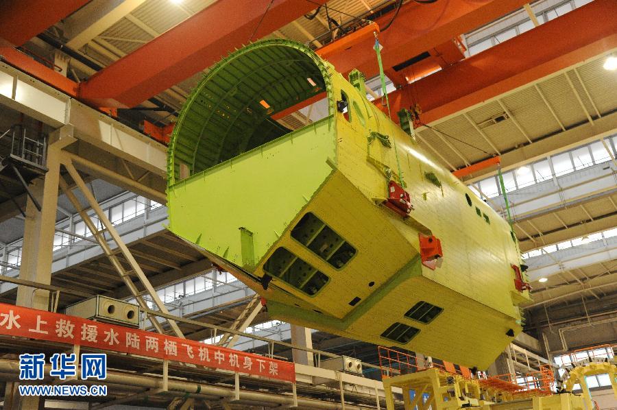 12月29日,大型滅火/水上救援水陸兩棲飛機AG600首個大部件中機身在中航飛機西安分公司順利下架。當日,大型滅火/水上救援水陸兩棲飛機AG600首個大部件——中機身在中航飛機西安分公司順利下架,標誌着AG600飛機進入整體裝配階段,項目研製取得階段性成果。 AG600飛機是國務院立項批覆的三個大型民機飛機項目之一。主要用於森林滅火和水上救援。 新華社記者 李華 攝
