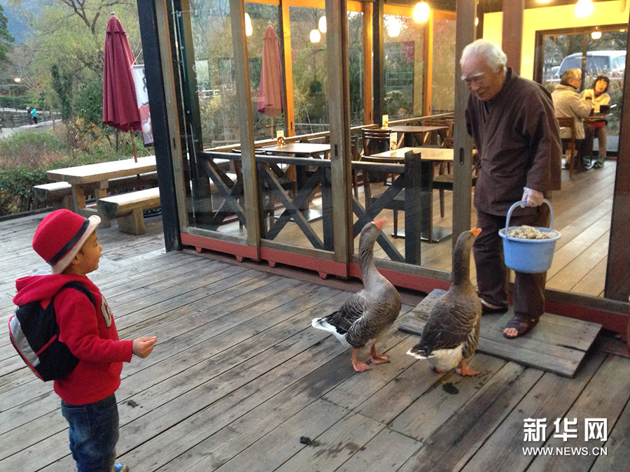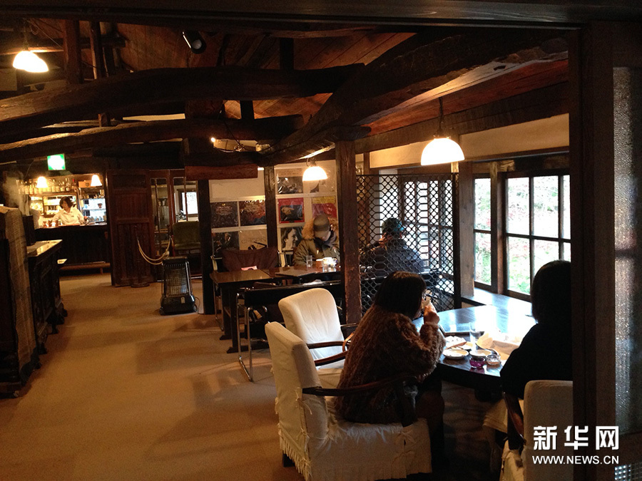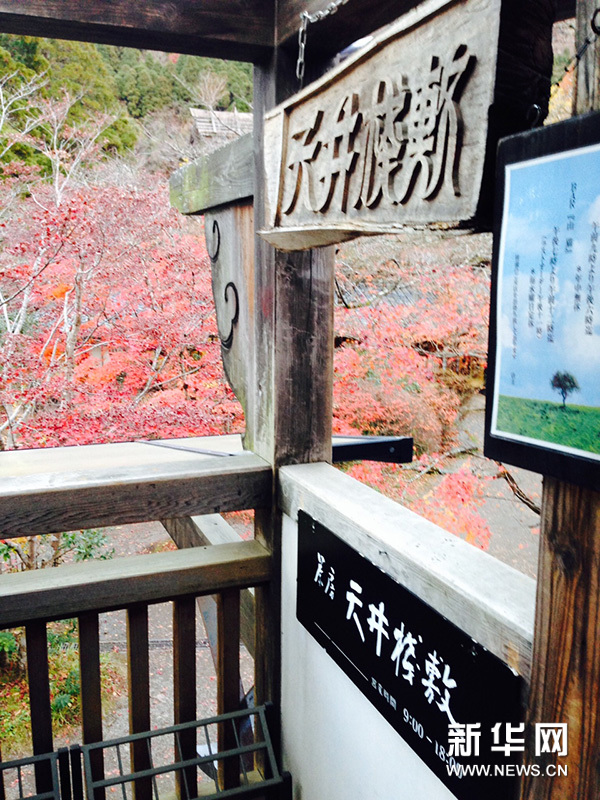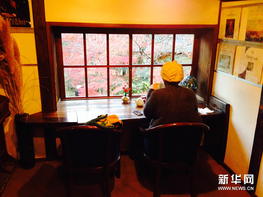 咖啡屋叫“天井棧敷”(てんじょうさじき),因風景美,芝士蛋糕好吃而頗有名氣。咖啡屋在林中的小二樓上,我們去時正滿座。這麼有名的咖啡屋,這麼美的秋景前,滿座正常。於是老公把名字寫上排隊,我們在門外小花園的桌前休息,邊欣賞秋日美景邊等待。