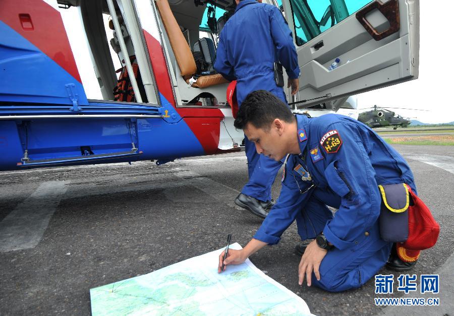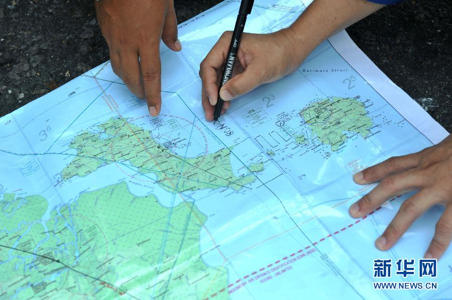 12月29日,在印度尼西亞邦加勿裏洞附近,飛行員在起飛前標記航圖。當日,印度尼西亞派出空警在勿里洞島附近海域搜尋亞航QZ8501航班的下落。12月28日,亞航QZ8501航班在勿里洞島附近海域失聯。新華社發(維裏 攝)