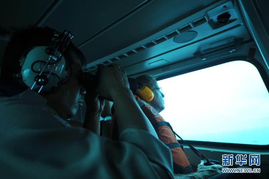12月29日,搜救人員在直升機上巡查印度尼西亞勿里洞島附近海域。當日,印度尼西亞派出空警在勿里洞島附近海域搜尋亞航QZ8501航班的下落。12月28日,亞航QZ8501航班在勿里洞島附近海域失聯。新華社發(維裏 攝)