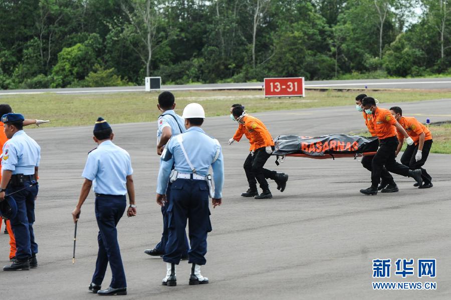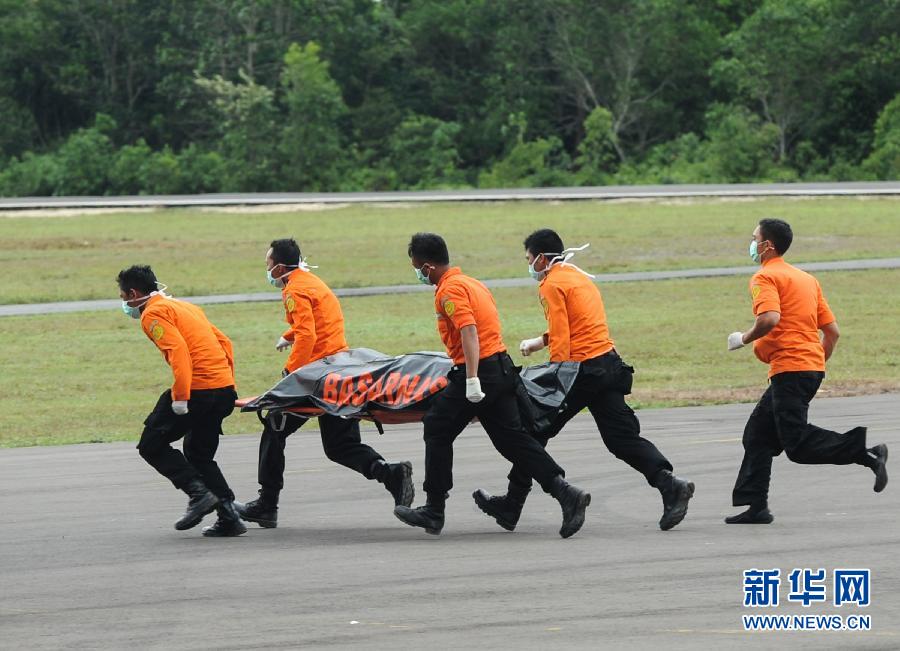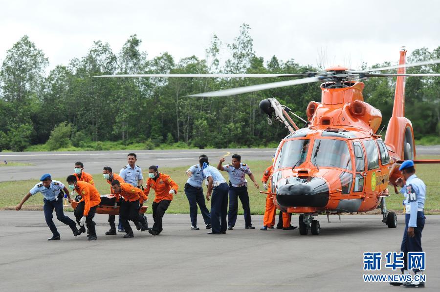 2014年12月31日,在印度尼西亞中加里曼丹省邦加蘭布翁,救援人員將遇難者遺體從直升機搬運到救護車上。亞航失事客機的打撈和搜救工作當日恢復,目前已打撈出6具遺體。 新華社發(薩努裏攝)