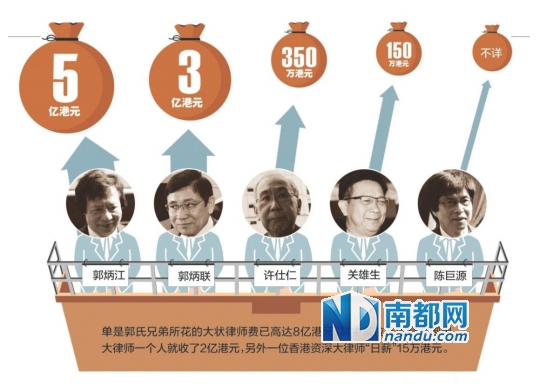 單是郭氏兄弟所花的大狀律師費已高達8億港元。其中某位英國皇家御用大律師一個人就收了2億港元,另外一位香港資深大律師“日薪”15萬港元。