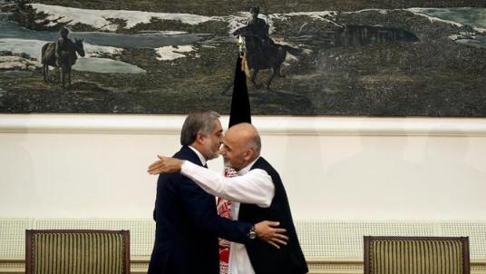 2014年9月22日,阿富汗新當選總統加尼(右)與總統候選人阿卜杜拉在簽署建立團結政府相關協議後擁抱。
