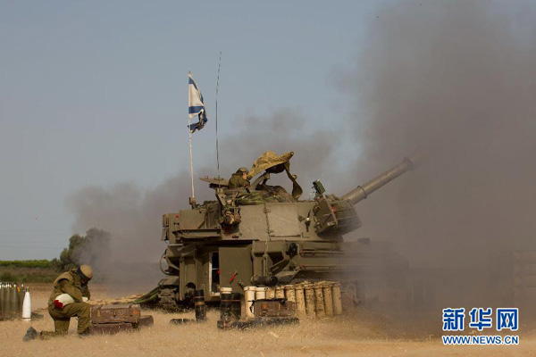 2014年7月12日,在以色列南部與加沙的邊境,一門以軍自行榴彈炮向加沙地帶開火。新華社/基尼圖片社
