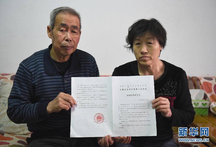 2014年12月31日,呼格吉勒圖父母收到國家賠償決定書。 2014年12月30日,內蒙古自治區高級人民法院依法作出國家賠償決定:支付呼格吉勒圖父母李三仁、尚愛雲國家賠償金共計2059621.40元,31日上午送達賠償決定書。新華社記者 邵琨 攝