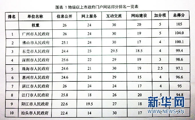新華網廣州12月30日電(崔凌雲) 12月30日下午,2014年度廣東省政府網站公共服務程度評測結果在廣州發佈。廣州、佛山、東莞三市排名地市級以上市政府門户網站前三位。廣東省環保廳、廣東省地方税務局、廣東省住房和城鄉建設廳、廣東省公安廳和廣東省國土資源廳排名省直部門政府網站前五名。