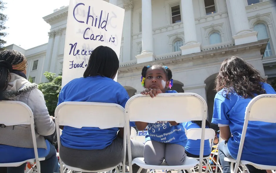 薩里亞·米切爾,4歲,和她的母親泰莎坐在一起,參加2015年5月6日在薩克拉門託舉行的呼籲增加兒童保育補貼的集會。美聯社照片/裏奇·佩德朗切利美國正在意識到兒童保育是一個主要的政治問題。早在1月份,奧巴馬總統首次詳細討論了這個問題在他的國情諮文中。“在今天的經濟中,當雙親都在職場對許多家庭來説是經濟必要時,我們比以往任何時候都更需要負擔得起的高質量兒童保育,”總統説,來自全國各地的父母們歡呼(或無奈地喊道“終於!”)。