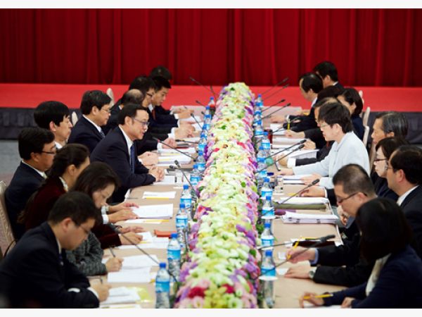(11月30日,海協會常務副會長鄭立中(左)與海基會副董事長施惠芬在兩會協議執行成果總結會上會談。新華社記者姜克紅攝)