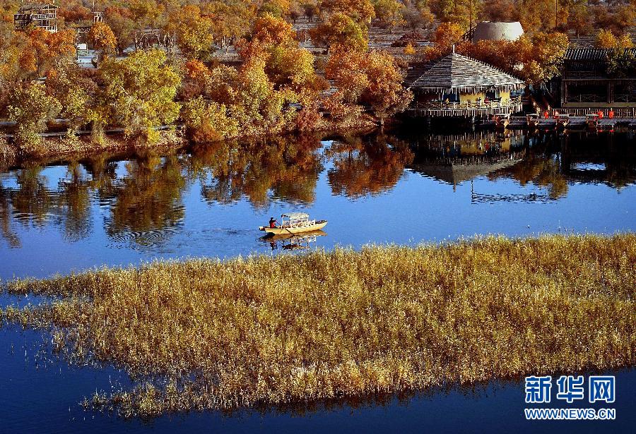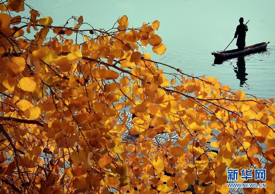 在巴楚縣胡楊海景區,漁民划着獨木舟準備上岸(11月2日攝)。深秋時節,在新疆巴楚縣葉爾羌河中、下游的廣袤地區,連片的胡楊樹林景色迷人,黃燦燦的枝葉在沙漠間、水岸旁隨風舞動,奇妙美景處處顯現。巴楚縣是我國胡楊林分佈最多的地區之一,原始野生胡楊林面積達316萬畝。(新華社記者王頌 攝)