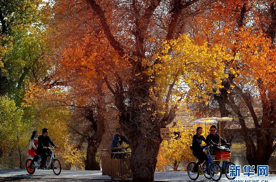 在巴楚縣胡楊海景區,遊客們騎車穿行在胡楊林間(11月2日攝)。深秋時節,在新疆巴楚縣葉爾羌河中、下游的廣袤地區,連片的胡楊樹林景色迷人,黃燦燦的枝葉在沙漠間、水岸旁隨風舞動,奇妙美景處處顯現。巴楚縣是我國胡楊林分佈最多的地區之一,原始野生胡楊林面積達316萬畝。(新華社記者王頌 攝)
