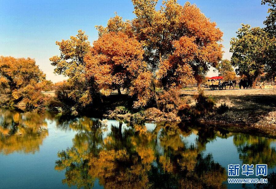 巴楚縣胡楊海景區內傍水而生的胡楊林(11月2日攝)。深秋時節,在新疆巴楚縣葉爾羌河中、下游的廣袤地區,連片的胡楊樹林景色迷人,黃燦燦的枝葉在沙漠間、水岸旁隨風舞動,奇妙美景處處顯現。巴楚縣是我國胡楊林分佈最多的地區之一,原始野生胡楊林面積達316萬畝。(新華社記者王頌 攝)