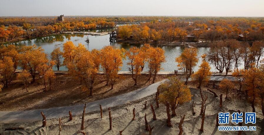 巴楚縣胡楊海景區一角。深秋時節,在新疆巴楚縣葉爾羌河中、下游的廣袤地區,連片的胡楊樹林景色迷人,黃燦燦的枝葉在沙漠間、水岸旁隨風舞動,奇妙美景處處顯現。巴楚縣是我國胡楊林分佈最多的地區之一,原始野生胡楊林面積達316萬畝。(新華社記者王頌 攝)