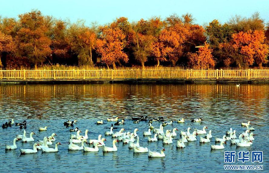 在巴楚縣胡楊海景區,水禽遊弋在湖中(11月2日攝)。深秋時節,在新疆巴楚縣葉爾羌河中、下游的廣袤地區,連片的胡楊樹林景色迷人,黃燦燦的枝葉在沙漠間、水岸旁隨風舞動,奇妙美景處處顯現。巴楚縣是我國胡楊林分佈最多的地區之一,原始野生胡楊林面積達316萬畝。 (新華社記者王頌 攝)