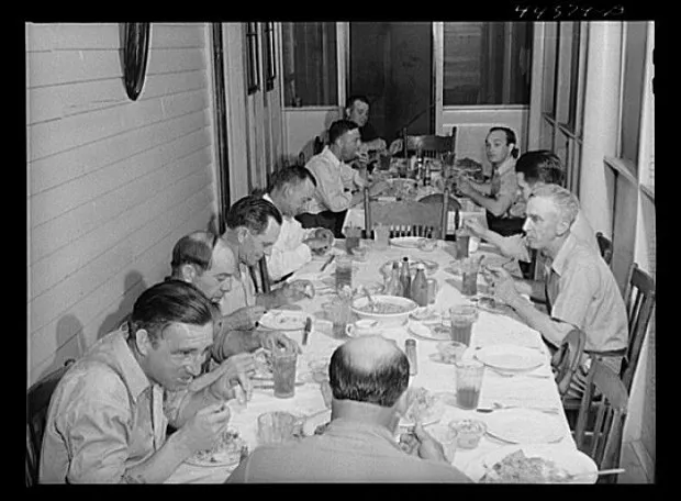 1941年,來自阿拉巴馬州軍火廠的工人在他們的寄宿房吃晚餐。美國農場安全管理局/國會圖書館在某些情況下,這些寄宿房也保留了某人的原文化,同時幫助他們理解新社區的習俗。例如,去年的電影布魯克林中,其他寄宿者教天真無邪的愛爾蘭移民艾莉斯·萊西(由西爾莎·羅南飾演)如何卷和啃意大利麪,之後她將拜訪她的意裔美國男友的父母。