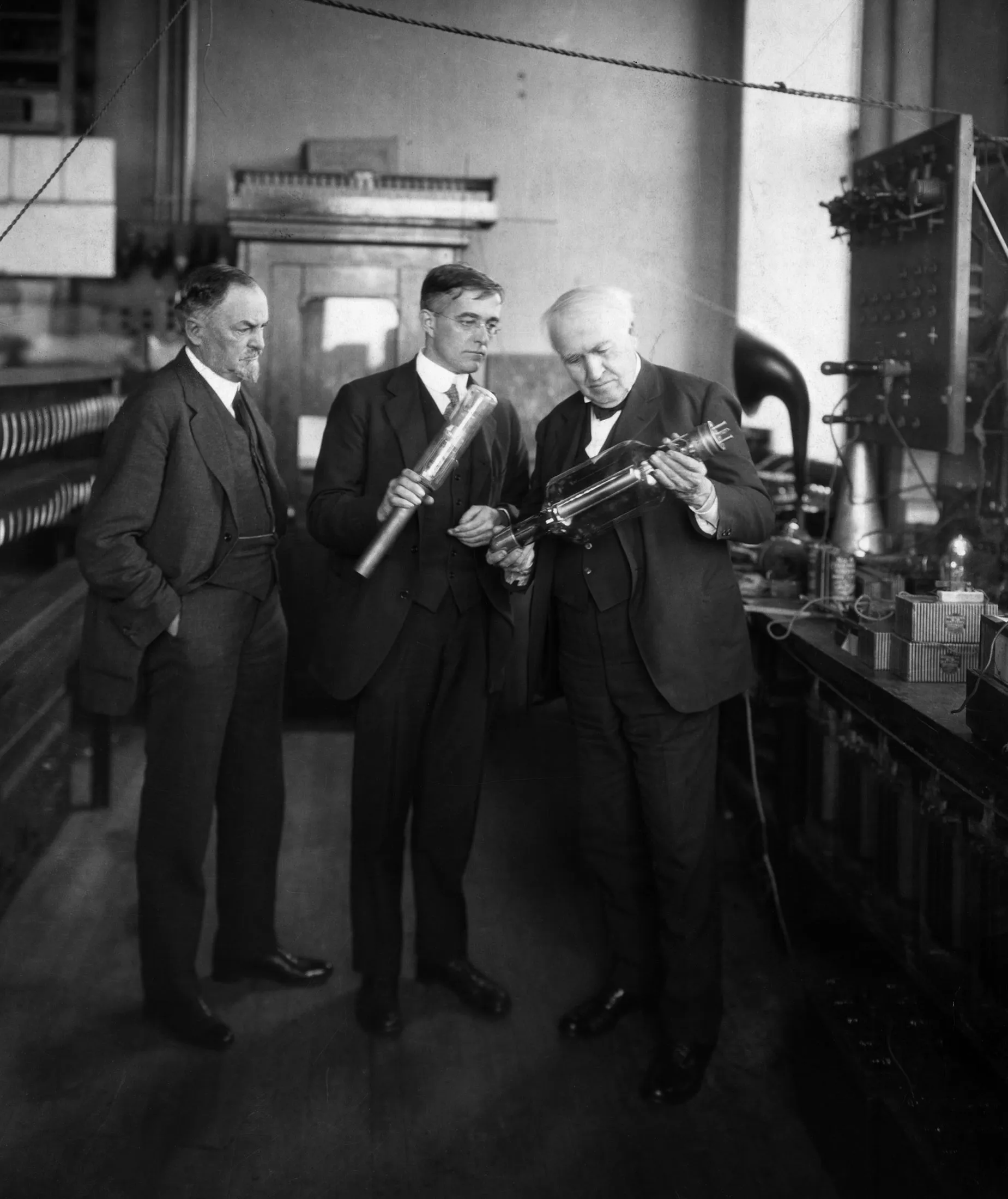 托馬斯·愛迪生(右)和歐文·朗繆爾博士(中)在紐約斯克內克塔迪的通用電氣研究實驗室討論真空管,時間大約在1904年至1925年之間。