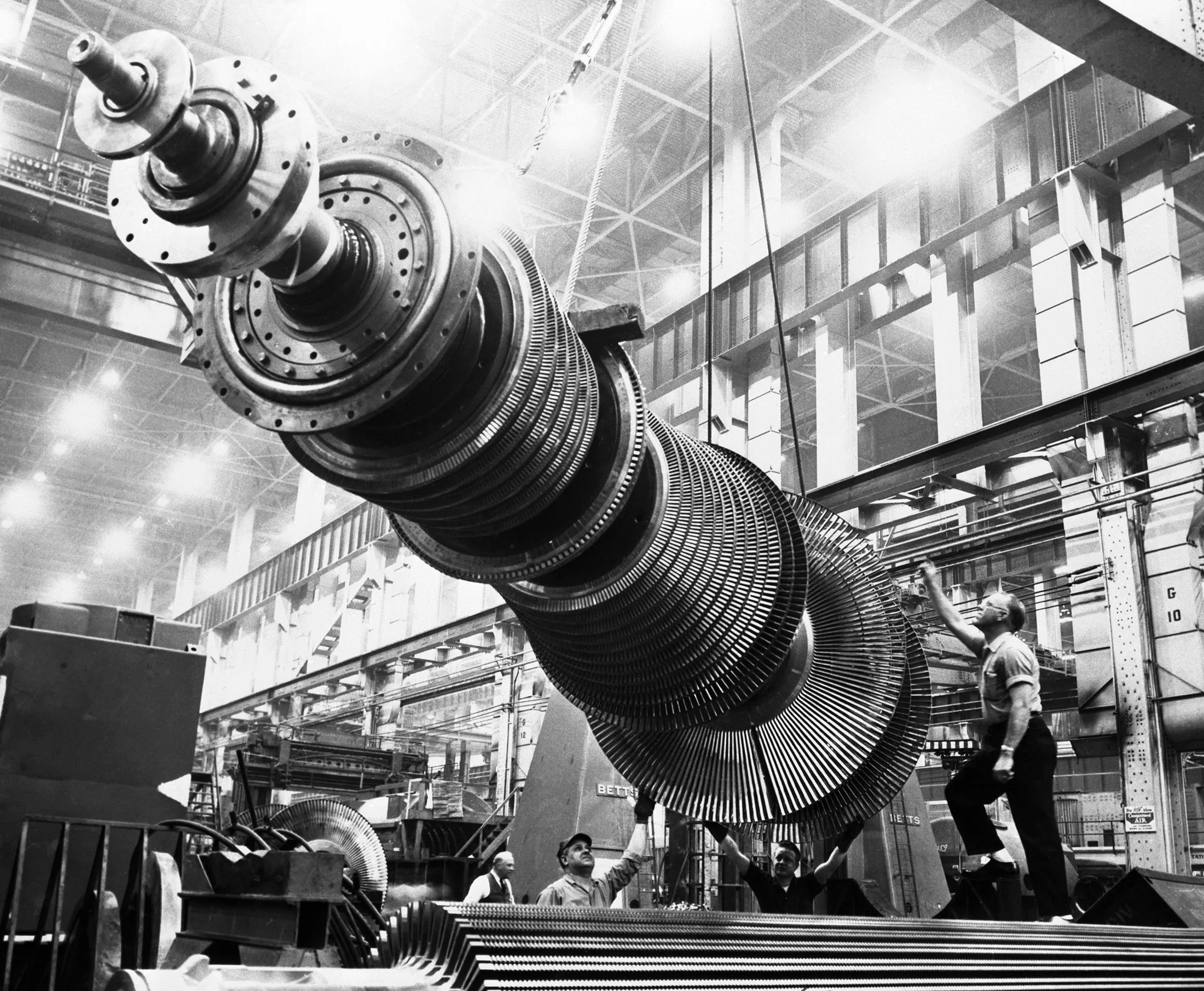 一個渦輪轉子,正在1952年2月21日由一台巨型起重機在紐約斯肯克塔迪的通用電氣渦輪工廠吊起。作為渦輪發電機的核心,轉子的重量為42,200磅,但其精度堪比最精細的手錶。