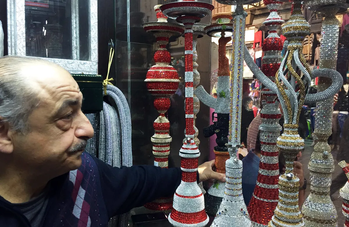 來源:唐娜·阿布-納斯爾漢尼·哈姆紮在哈米迪耶市場出售鑲嵌閃亮珠子的水煙管,他説他做了一個形狀像步槍的水煙管,顏色是敍利亞國旗的顏色。他説這是為了表達“我們在敵人摧毀我們國家面前的堅定不移”。