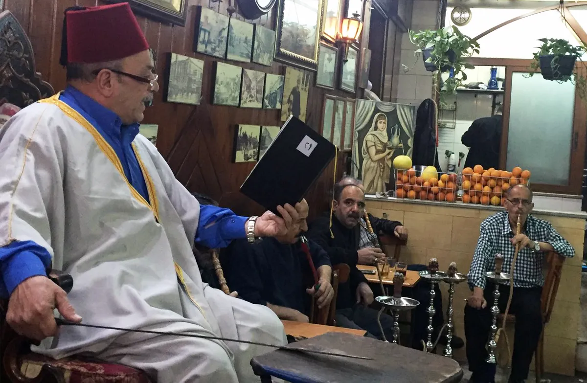 位於百年曆史的烏瑪亞德清真寺後面的諾法拉咖啡館一直保持着講故事的藝術。在最近的一個晚上,57歲的艾哈邁德·阿爾-拉哈姆講述了一個國王解放被邪惡西方對手捕獲的奴隸的故事。拉哈姆用一根長金屬棍敲打,以保持顧客的注意力。