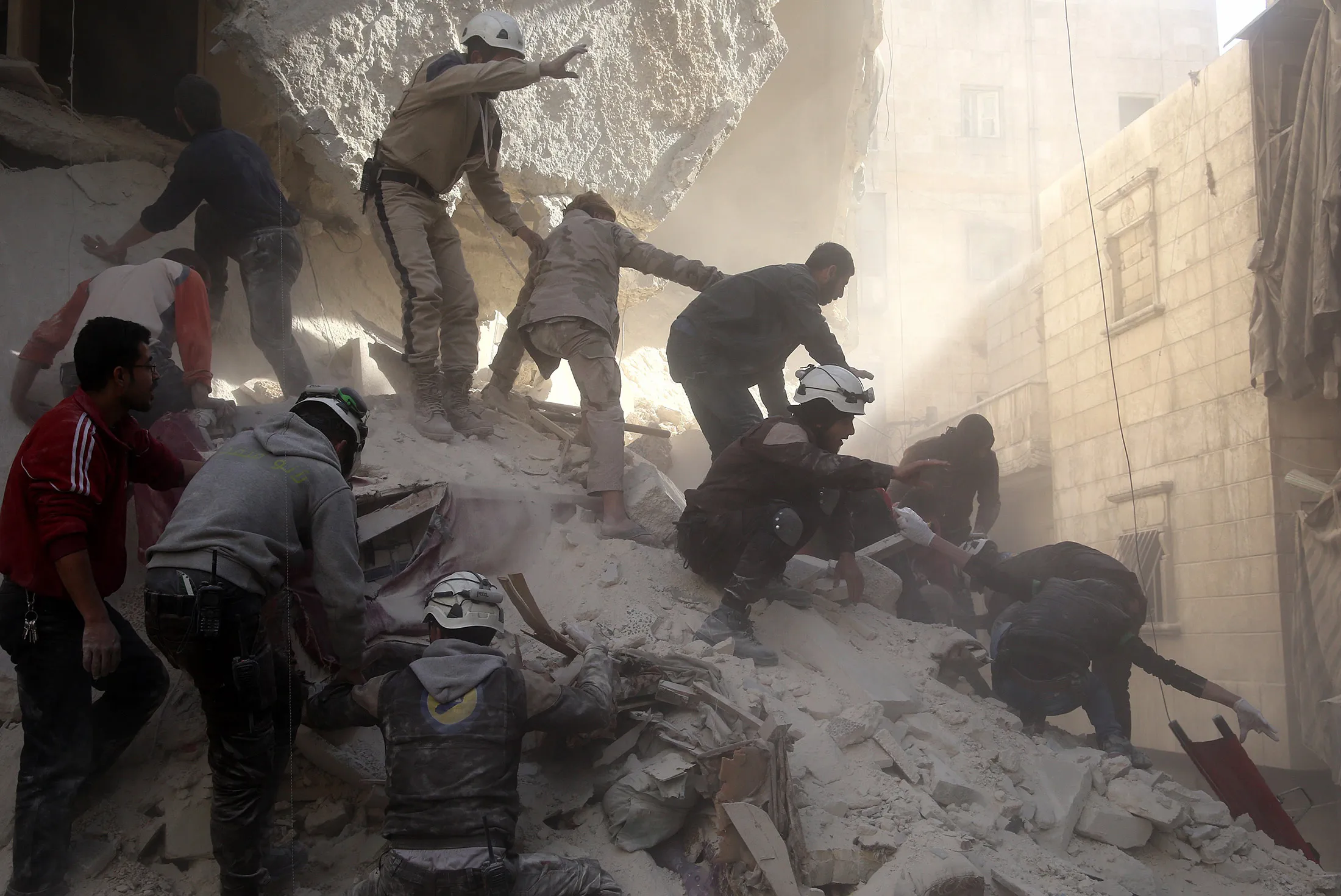 民防隊成員在阿勒頗的廢墟中救援人員。