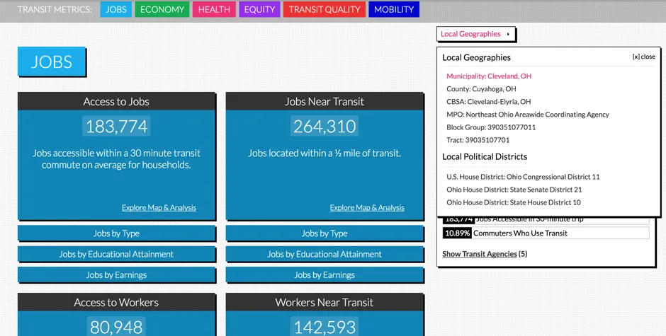 全交通例如,輸入俄亥俄州的哥倫布——一個不以良好公共交通而聞名的城市。全交通提供了六個不同的指標,以瞭解公交車和火車(如果哥倫布有渡輪的話)如何為當地居民服務。以就業為例:使用 人口普查數據,該工具計算出平均家庭在30分鐘內通過公共交通可到達多少個工作崗位,距離公共交通半英里內有多少個工作崗位,以及平均而言,多少工人可以被僱主接觸到。(相對而言,並不多。)