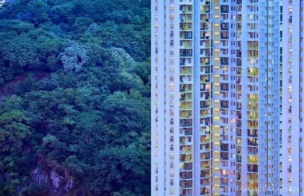 但雅克-拉格雷茲在照片中捕捉到的,不僅僅是對比的光線。在一些圖像中,他捕捉到了香港公寓塔樓的統一重複與城市巨大山丘的鬱鬱葱葱的頂部之間的對比。在其他圖像中,城市景觀的密集混亂與附近寧靜的河流形成鮮明對比。
