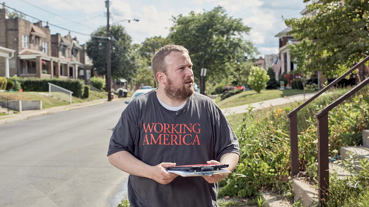 工人美國的託德·福斯試圖説服匹茲堡郊區的選民選擇克林頓。