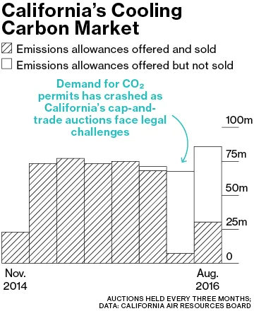 在上一個財政年度結束於6月30日,加利福尼亞州的碳交易收入比民主黨州長傑瑞·布朗預測的24億美元少了約6億美元。今年的缺口看起來要大得多。最新的碳交易拍賣於8月16日舉行,僅為州政府帶來了800萬美元,約三分之二的排放許可證未售出。這緊隨5月的拍賣,只有10%的許可證被售出,僅籌集了1000萬美元。布朗曾希望碳交易收入在本財政年度達到20億美元,這筆錢是他用來資助他心愛的綠色項目,特別是640億美元的高速鐵路系統。