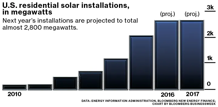 攝影師:塞爾吉奧·弗洛雷斯/彭博社這本應是太陽能的時刻。由於電池板成本下降,使其發電更具競爭力,美國的住宅電池板安裝在2015年增長了71%。在12月,國會意外地延長了原定於2016年底到期的税收抵免。電池板購買者將在2019年前獲得新太陽能電池板成本的30%報銷,至少在2021年前獲得22%的報銷。