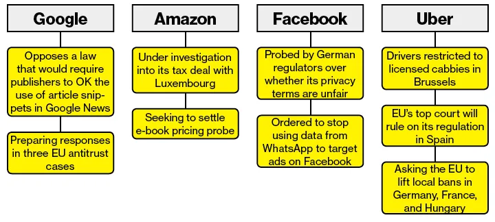 插畫師:西蒙·阿布拉諾維奇如今,對於在歐盟內開展業務的硅谷公司來説,好運氣短缺,歐盟有5.08億消費者和日益激進的監管機構。在法國審查谷歌的税務做法時,歐盟的執行機構——歐洲委員會,也在追究與安卓、廣告和購物搜索服務相關的反壟斷指控。委員會還向蘋果公司開出了145億美元的補税賬單,因其在愛爾蘭的優惠税務協議;它正在調查亞馬遜的税務和Kindle定價;並考慮要求流媒體視頻服務在其庫中至少包含20%的歐洲製作材料。