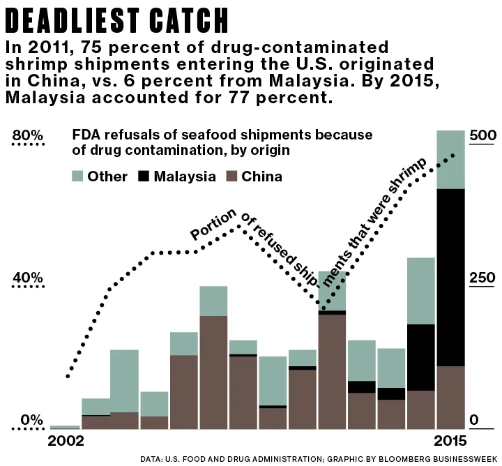 根據聯合國的數據,900億美元的水產養殖貿易幾乎佔所有捕撈或收穫海鮮的一半。中國提供了全球總量的近60%,並且是最大的出口國。美國食品監管機構已知曉該國的抗生素問題超過十年。食品和藥物管理局在2006年秋季加強了對從中國進口的養殖海鮮的監測,發現四分之一的檢測樣本含有未批准藥物和不安全食品添加劑的殘留物。次年6月,對所有來自中國的養殖蝦和其他幾種海鮮實施了進口警報,允許該機構在每批貨物通過實驗室分析證明未受污染之前,在港口扣留這些產品。