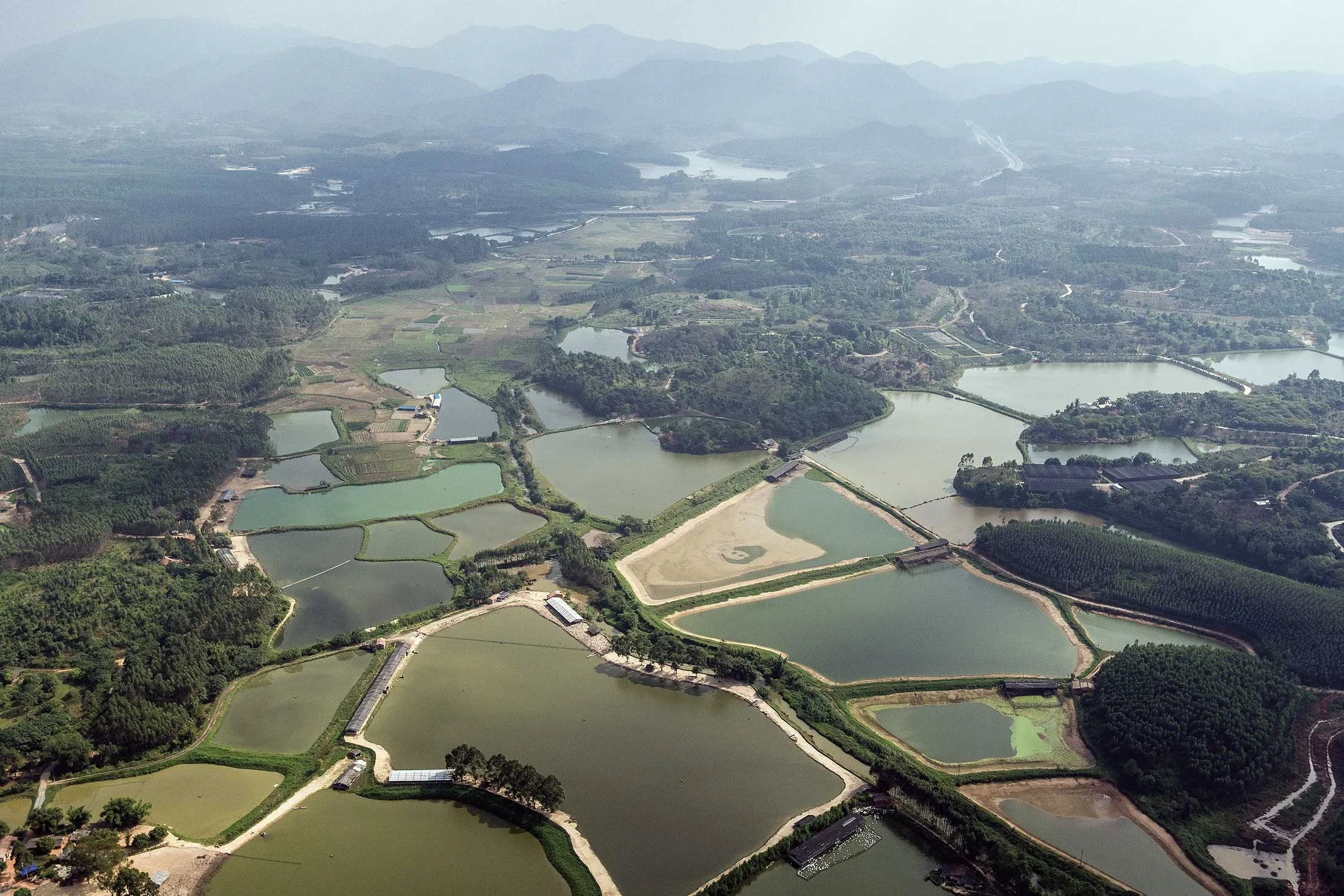 從空中看,位於中國南方廣東省的珠江三角洲像顯微鏡下的一團人類細胞。成千上萬的小矩形塊,都是綠色的陰影,聚集在城市和水道之間。養殖場散佈在數千個海鮮養殖場之間,形成了該國水產養殖業的核心,這是世界上最大的水產養殖業。