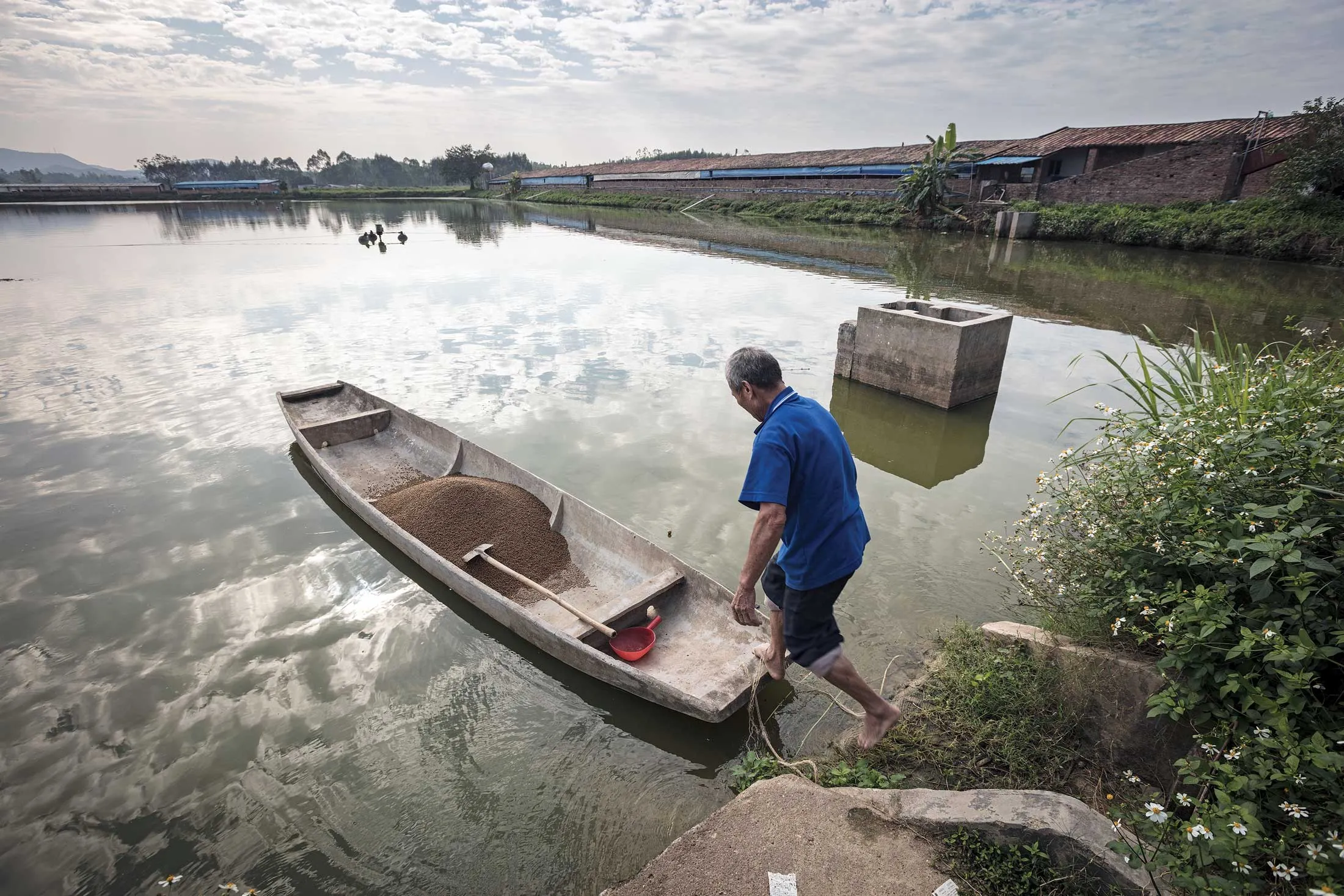 在一個潮濕的六月天,靠近肇慶的一個魚塘旁,一名戴着寬邊草帽的農場工人正在沖洗一間養豬場的水泥地面,那裏白色和花色的豬在嗅聞和哼哼。豬圈裏的髒水流入一根金屬管道,直接排入一個與數十隻鵝共享的池塘。當黃褐色的水從管道中濺出時,羅非魚拍打着跳躍,渴望着下午的餵食。