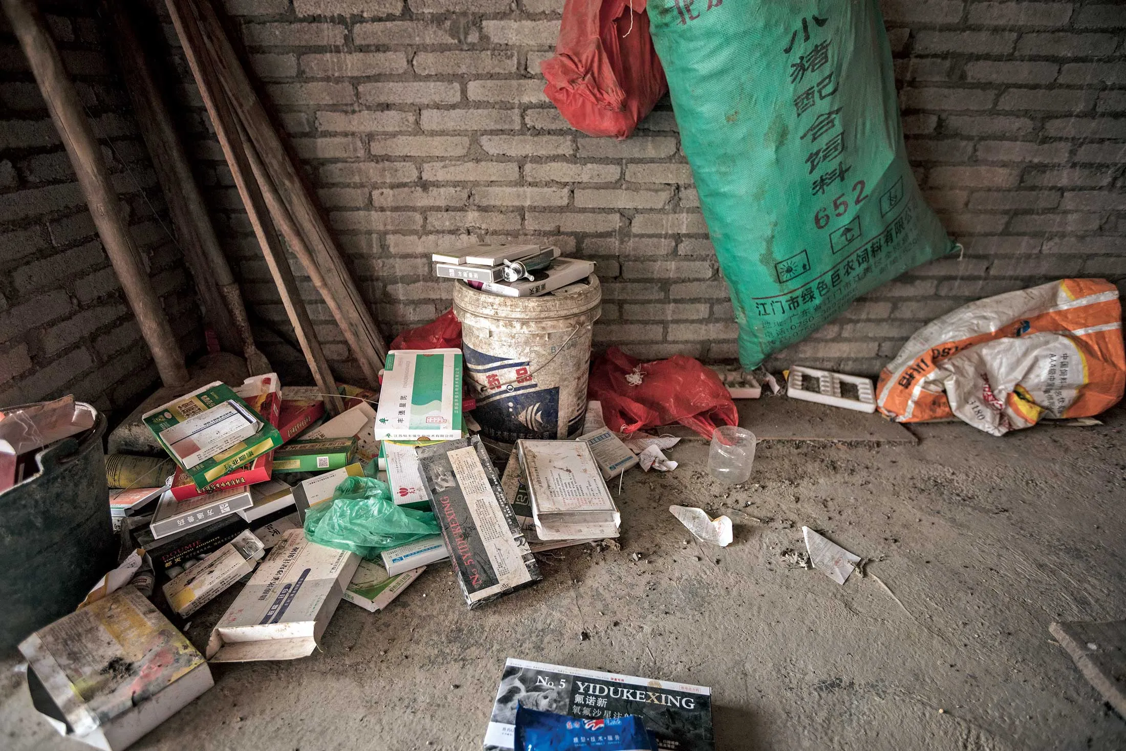 在另一個農場,位於江門,一名農民撒下一勺穀物以喚醒她沉睡的豬,這些豬被圈在一個有2萬條鯉魚的池塘邊。飼料中含有三種抗生素,包括粘菌素,這在人體中被視為最後的抗生素。粘菌素在美國被禁止用於養豬,但直到11月,中國政府最終採取措施之前,它在中國的動物飼料中被廣泛使用。九種其他抗生素的瓶子和容器散落在20頭母豬的養豬場——在架子上、購物袋裏和垃圾堆上。世界衞生組織已將其中七種藥物視為對人類醫學至關重要。