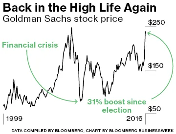 自特朗普獲勝以來,市場對高盛2017年利潤的預期飆升,過去一個月上漲了5.43億美元,達到76.7億美元,根據彭博社對九位分析師的平均估計。該公司的股價飆升是道瓊斯工業平均指數向20,000點攀升的最大推動力。