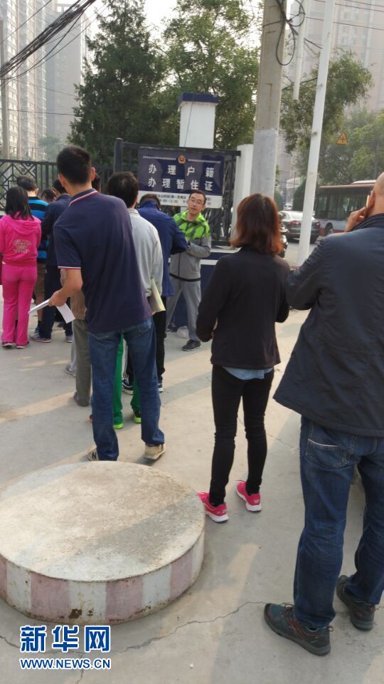 10月1日上午九時許,前來辦理北京市居住證的人在昌平區東小口派出所門前排起長隊。新華網記者 李志強 攝