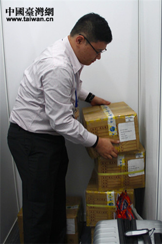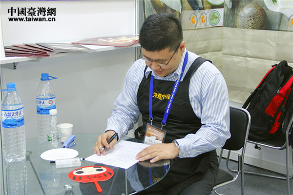 林泳宸整理消費者的反饋意見。他告訴記者,與消費者面對面交流,讓他了解大陸消費者的需求,有助於進一步改良產品,開拓大陸市場。(中國台灣網 郜利敏 攝)