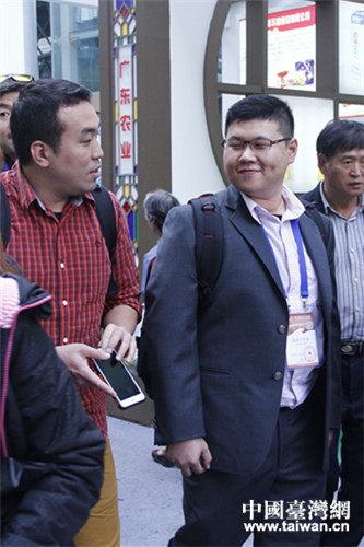 林泳宸與志願者愉快聊天。本屆農交會為台灣展區的每個展位都配備了志願者。林泳宸説,他倆溝通起來特別順暢,配合默契。相同的語言、文化背景讓他感覺特別親切。(中國台灣網 郜利敏 攝)