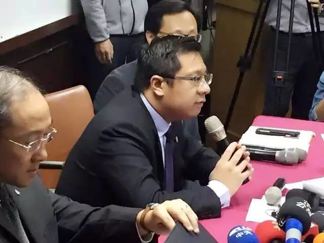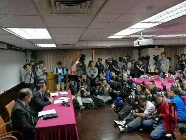 復興航空董事長林明升(持話筒者)宣佈董事會決議解散復興航空,即日起全面停航。