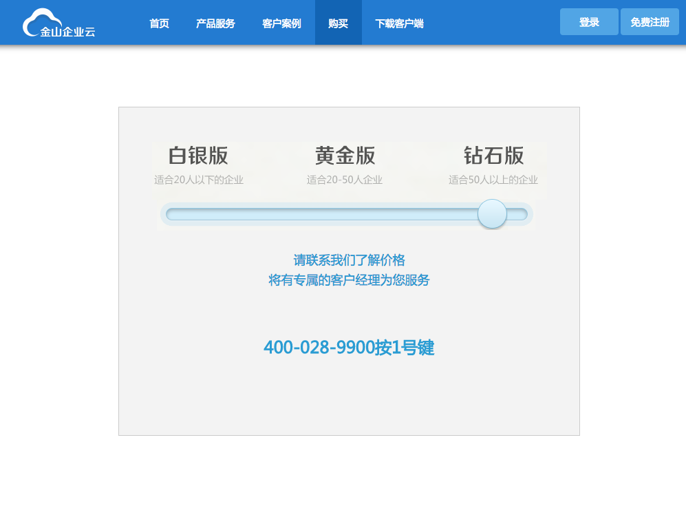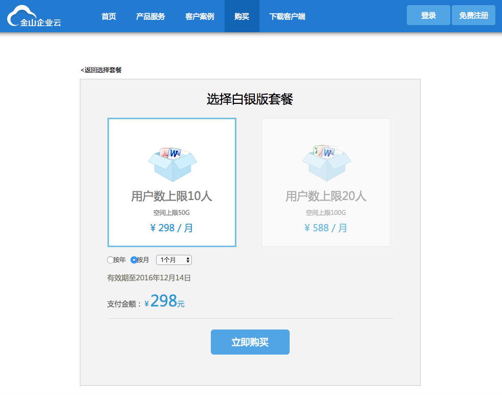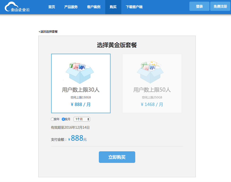 金山企業雲服務包含:適合20人以下的白銀版,適合20-50人的黃金版,以及適合50人以上的鑽石版。用户可以根據自己的需要自主選擇套餐,並可任意選擇按年或者按月兩種方式計價,以黃金版為例,購買用户上限為30人的套餐,需要支付888元/月的費用。