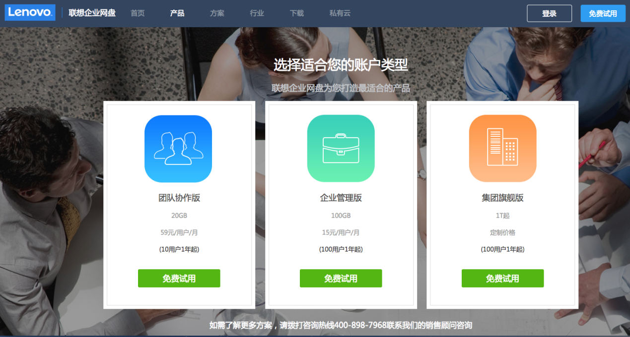 聯想企業網盤提供三個可試用版本,分別為:20G容量、10個用户1年起的團隊協作版,用户需要承擔7080元的費用;100G容量、100個用户1年起的企業管理版,用户需要承擔18000元的費用;1T起容量、100用户1年起的集團旗艦版,此版本為聯想定製價格。