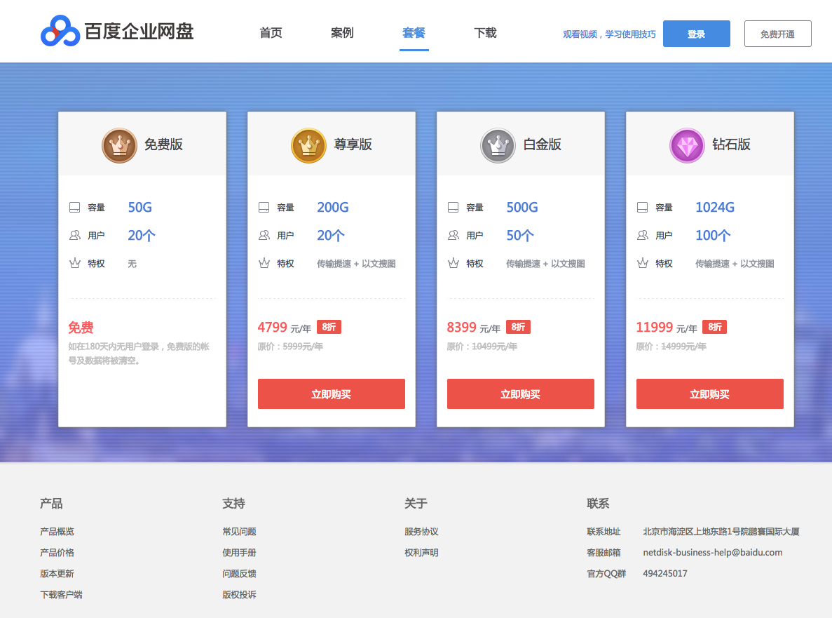 百度企業網盤50G的空間為免費版,但對於企業而言,高清照片和視頻資料很多,動輒便會超過百G,50G的容量很難滿足企業的需求;而其餘三版價格則大幅提高,價格變化範圍較大,鑽石版更是萬元出頭,價格實屬不菲。