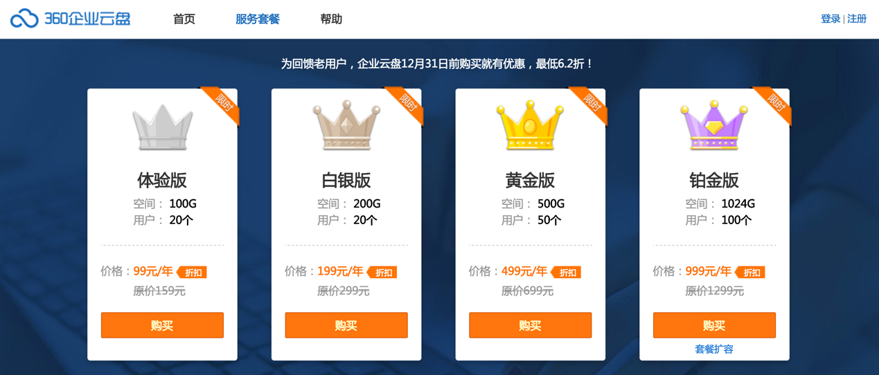 鉑金版空間為1024G,最多支持用户100個,價格為999元/年,每天僅需2.73元。
